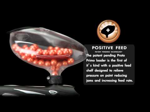 The Proto Primo Paintball Loader is the first of its kind with a positive feed shelf designed to relieve pressure on paint, reducing jams and increasing feed rate. Powered by minimal agitation of the gun (no batteries required), the Primo Loader helps sort and funnel as you shoot for a consistent vertical feed. It comes with a clear spring lid for easy reload. The large opening works well with proto alpha pods for the ultimate paint carrying system. The large capacity durable shell holds 200 paintballs and is easy to clean and maintain.